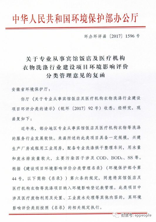 你厅《关于专业从事宾馆饭店及医疗机构衣物洗涤行业建设项目环评分类的请示》(皖环〔2017〕92号)收悉。经研究,现函复如下: